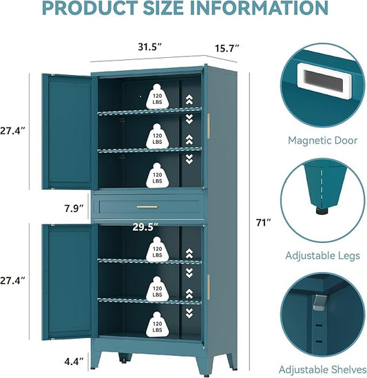 71" Tall Metal Storage Cabinet with Adjustable Shelves,Farmhouse Kitchen Pantry Cabinet with 2 Barn Doors and Drawer,Large Storage Cabinets for Dining Room,Bathroom,Living Room(Blue)