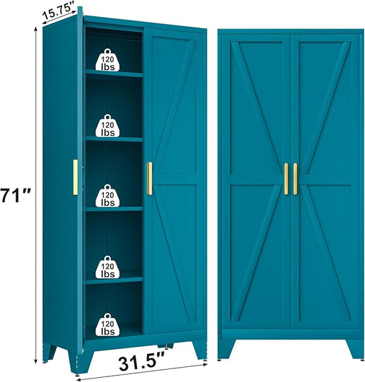 71H Tall Metal Storage Cabinet with 2 Doors and 5 Shelves,Farmhouse Storage Cabinet with Barn Doors,Pantry Storage for Home,Office,Bathroom,Dining Room,Kitchen(Blue)