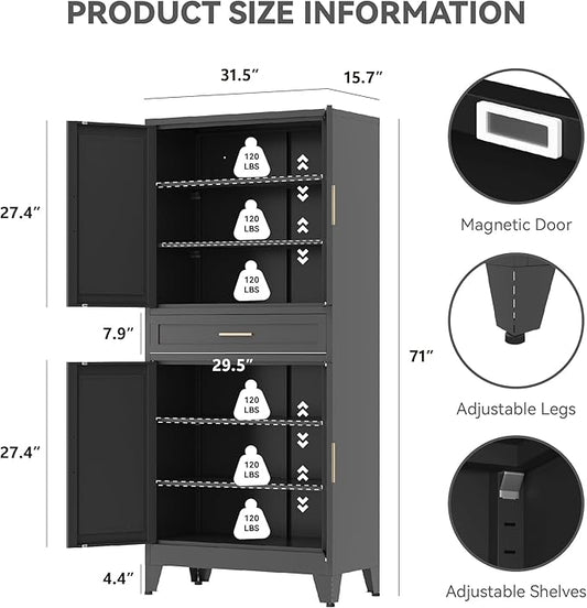 71" Tall Metal Storage Cabinet with Drawer and Adjustable Shelves,Farmhouse Kitchen Pantry Storage Cabinet with Doors,Large Wide Cabinets for Craft Room,Office,Dining Room,Bathroom(Black)