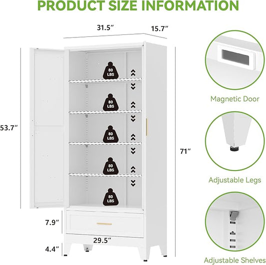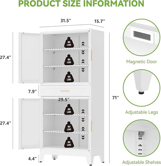 71" Tall Metal Storage Cabinet with Drawer and Adjustable Shelves,Farmhouse Kitchen Pantry Storage Cabinet with Doors,Large Wide Cabinets for Craft Room,Office,Dining Room,Bathroom(White)