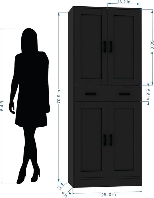 Black Kitchen Pantry, 71" Tall Storage Cabinet with Doors and Drawer for Kitchen, Hallway, Office