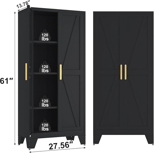 61H Metal Storage Cabinet with 2 Doors and 4 Shelves,Farmhouse Storage Cabinet with Barn Doors,Pantry Storage for Home,Office,Bathroom,Dining Room,Kitchen(Black)