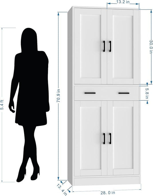 White Kitchen Pantry, 71" Tall Storage Cabinet with Doors and Drawer for Kitchen, Hallway, Office