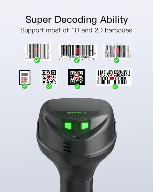 Inateck Wireless Barcode Scanner, 1D/2D QR Code Scanner with Smart Base, Bluetooth/2.4G/USB 3-in-1 Connectivity, Compatible with Windows/iOS/Android/Mac/Linux for Retail/Warehouse/Logistics