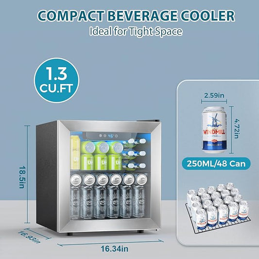 48 Can Beverage Refrigerator,12 Bottle Wine Cooler with Stainless Steel Glass Door, Digital Temperature Display, Countertop Mini Fridge for Soda, Wine or Beer, Silver