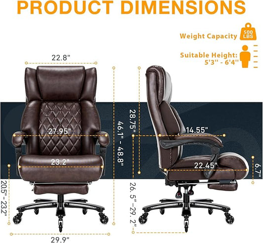 500 LBS Big and Tall Office Chair with Foot Rest High Back Recline Ergonomic Chair for Heavy People, Executive Office Chair Comfortable for Home Office, Large Computer Desk Chair Brown