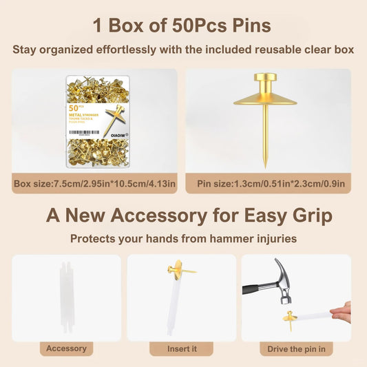 50pcs Gold Thumb Tacks for Picture Hangers - Heavy Duty Push Pins, Double Headed Thumbtacks for Hanging, Metal Wall Tacks, Pins, Nails, Hooks (Gold)