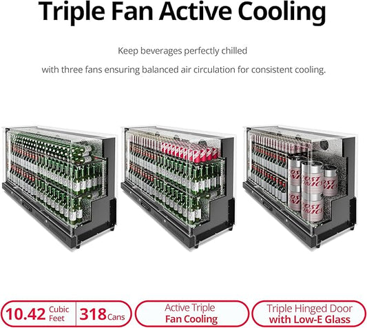 54 inch 318-can Triple Hinged Door Back Bar Cooler, 10.42 cu. ft. Under Counter Glass Door Bar Fridge with hinged doors, lockable, 32-50°F Beverage Refrigerator, ETL Certified, Black