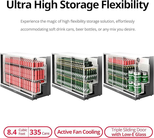 54 in. 335 cans Triple Sliding Door Back Bar Beverage Cooler, 10.8 cu. ft. Under Counter Glass Door Bar Fridge, lockable, 32-50°F Display Refrigerator, ETL & NSF7 Certified