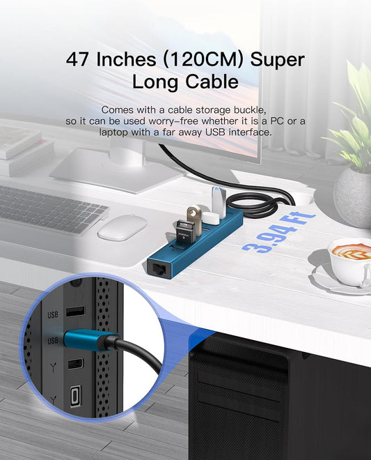 7 Ports USB 3.0 Hub, USB to Network HUB with 3.9ft Long Cable for Laptop, USB Splitter with Gigabit Ethernet Port and 5V/3A Power Port, MultiPort Aluminum Hub for iMac, PC, Flash Drives (Blue)