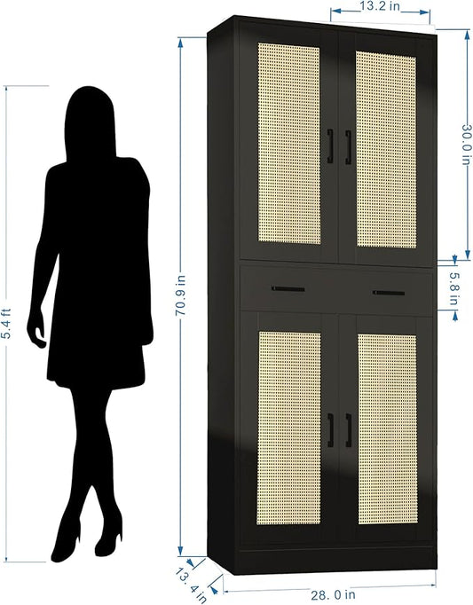 71" Tall Black & Rattan Pantry Cabinet - Boho Chic Kitchen Storage with Doors & Drawer for Dining Room, Hallway or Kitchen Organization