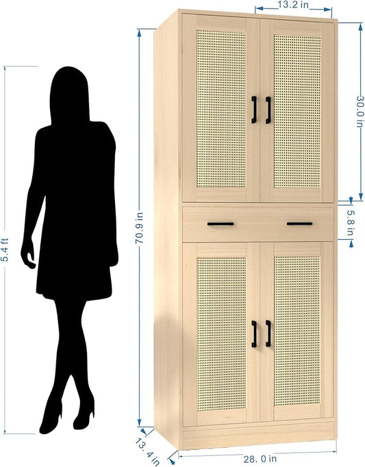 71" Tall Oak & Rattan Pantry Cabinet - Boho Chic Kitchen Storage with Doors & Drawer for Dining Room, Hallway or Kitchen Organization
