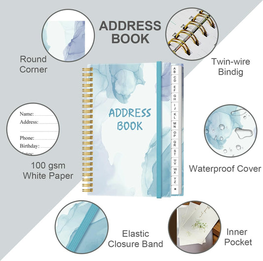 Address Book with Alphabetical Tabs - Small Address Book Spiral with Address Contacts, Special Date, Phone, Birthday & Internet Login Password for Home and Office, 4.3" x 6.2", Blue Watercolor