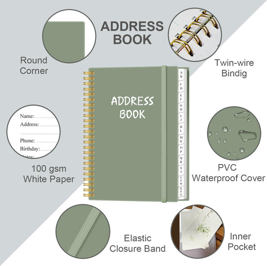 Address Book with Alphabetical Tabs - A5 Telephone & Address Book with Address Contacts, Special Date, Phone, Birthday & Internet Login Password for Home and Office, 6.2" x 8.5", Green
