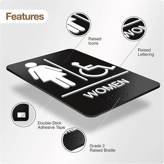 ADA Braille Womens Restroom Sign for Business with Double Sided 3M Tape - ABS Plastic Womens Bathroom Sign 9” x 6” for Offices and Restaurants