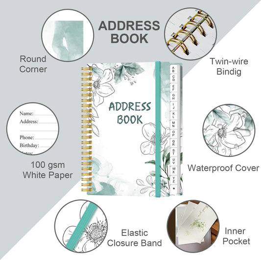 Address Book with Alphabetical Tabs - Small Address Book Spiral with Address Contacts, Special Date, Phone, Birthday & Internet Login Password for Home and Office, 4.3" x 6.2", Teal Leaf