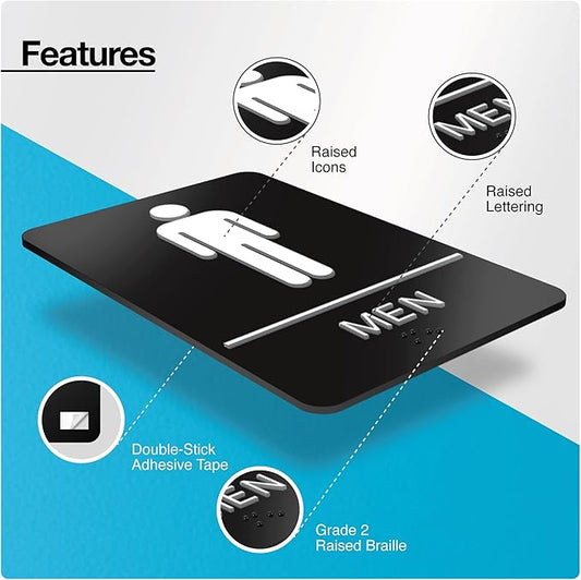 ADA Braille Mens Restroom Sign for Business with Double Sided 3M Tape - ABS Plastic Mens Bathroom Sign 9” x 6” for Offices and Restaurants
