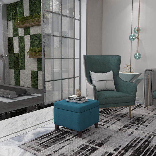 Adeco 18 Inch High Cube Ottoman Storage, Linen Chair Foot Stools, Upholstered Vanity Stool with Hinged Lid, Solid Wood Legs