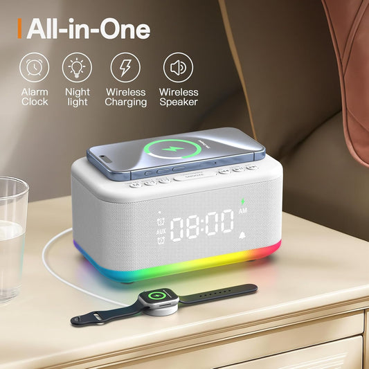 Alarm Clock Speaker Wireless Charger, Digital Alarm Clocks Bedrooms Bluetooth, Alarm Clock Dimmable Light Bedrooms Bluetooth Speaker Dual Alarm Snooze 12/24H Dimmer Support USB AUX, White