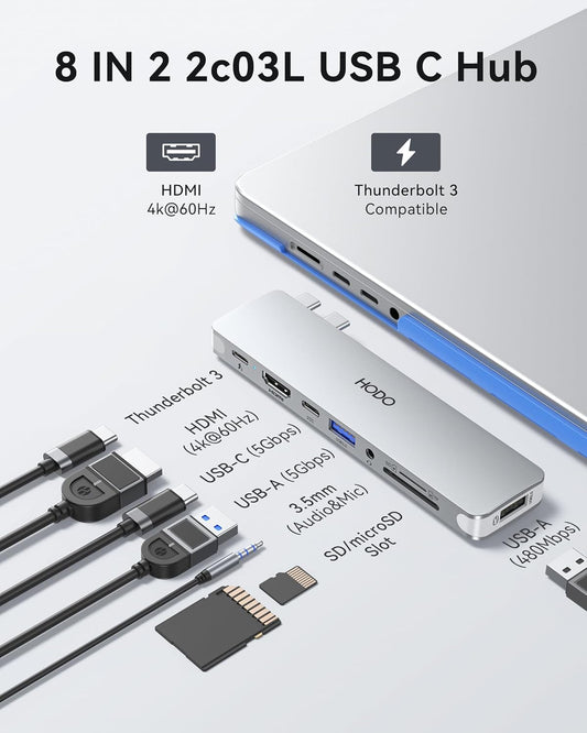 Apple MacBook Pro/Air USB-C Adapter Hub - Multiport 8-in-2 with HDMI, Thunderbolt 3, USB 3.0, 2.0, SD/TF Card Reader, Silver