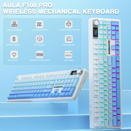 AULA F108 PRO - Wireless Mechanical Keyboard with Screen&Knob,Hot Swappable Gaming Keyboard with 8000mAh Battery,Pre-lubed Switches,RGB Backlit,PBT Keycaps Creamy Sounding Computer Keyboards,104 Keys