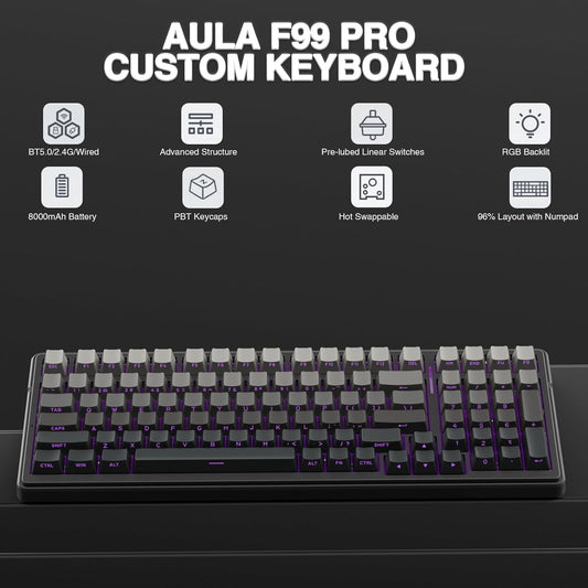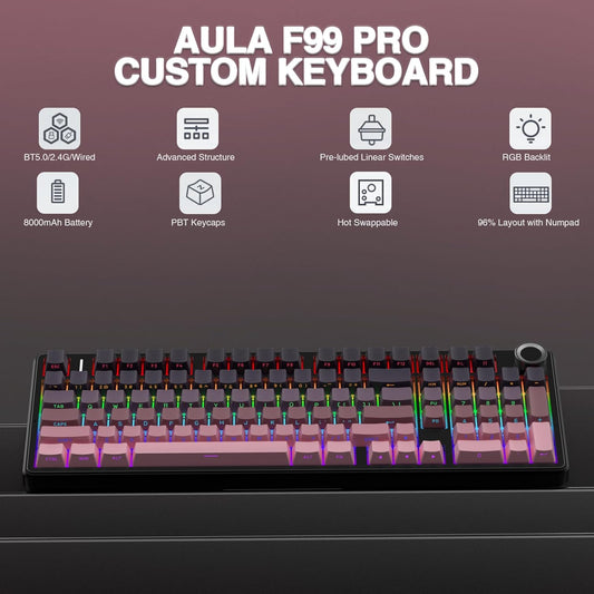 AULA F99 Pro Wireless Mechanical Keyboard,Hot Swappable Custom Keyboard,RGB Backlit,Pre-lubed Linear Switches,Side Printed PBT Keycaps,2.4GHz/USB-C/BT5.0 Mechanical Gaming Keyboards