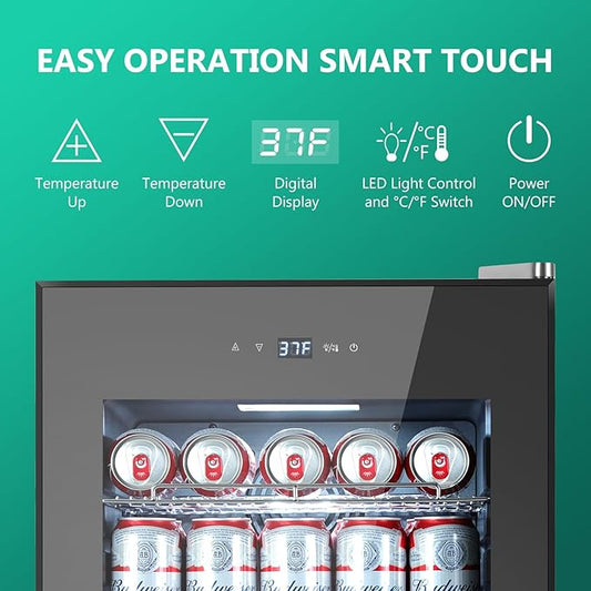101 Cans Compressor Beverage Refrigerator, 17 Inch Drink Fridge with Glass Door, Adjustable Removable Shelves, Quiet Operation, Temp Memory, Beer Cooler for Soda, Beer, Water, Home Bar, Office