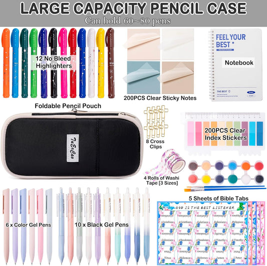 Bible Study Supplies for Women Men - Pencil Pouch Case, 75 Tabs, 12 No Bleed Highlighters, 6 Colored Pens, 10 Black Ink Pens, Washi Tapes & A5 Notebook -Christian Gifts Journaling Kit, Black