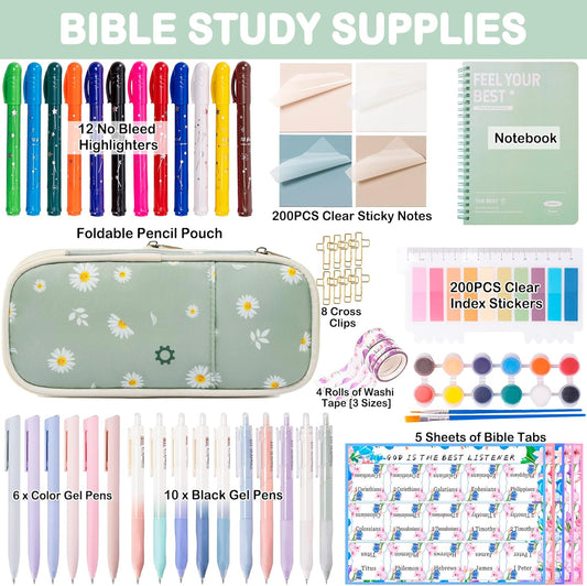 Bible Study Supplies for Women & Journaling Kit - Pencil Case, 12 Colored Highlighters No Bleed, 75 Index Bible Tabs, A5 Notebook, 16 Gel Pens & 4 Transparent Notes - Christian Gifts, Green Daisies