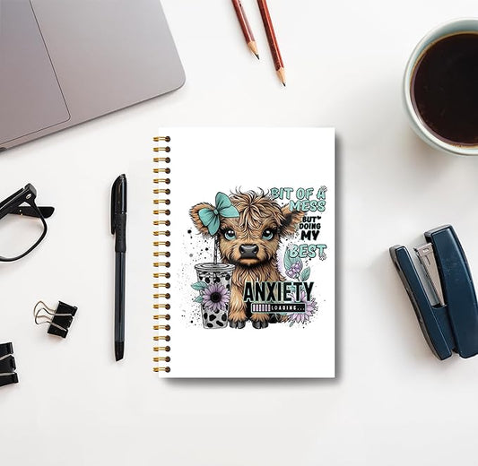 Bit of a Mess Anxiety Funny Highland Cow Notebook - Western Cow Notebook, Highland Cow Office Supplies, Highland Cow Gifts, Cow Lover Gifts, Cute Cow Stuff, Cow Spiral Notebook 5.5x8.3