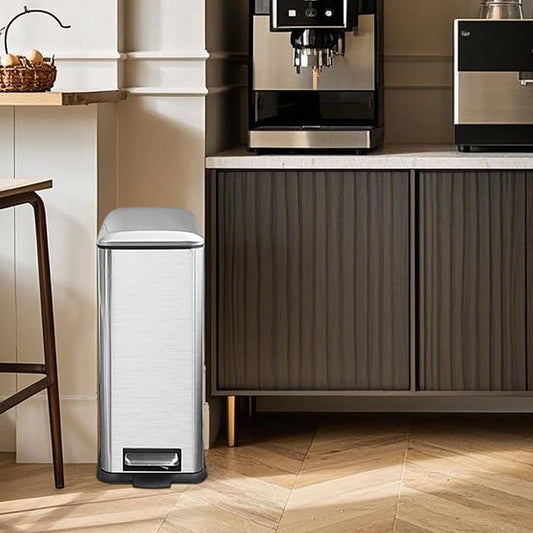 12 Gallon Slim Kitchen Trash Can, Metal Trash Can with Removal Inner Bucket and Soft-Close Lid, Foot Pedal, Stainless Steel Garbage Can 45 Liter, Silver