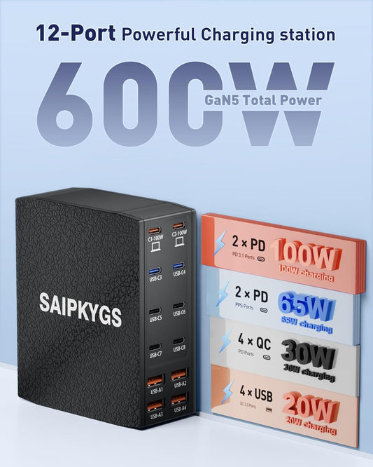 Charging Station (600W),12-Port USB C Charger Block with Dual 100W PD USB-C Fast Charging Station Hub for MacBook Pro/Air/All iPad iPhone 17/16 15/14/13/Pro Max/Samsung Galaxy Note (Black)