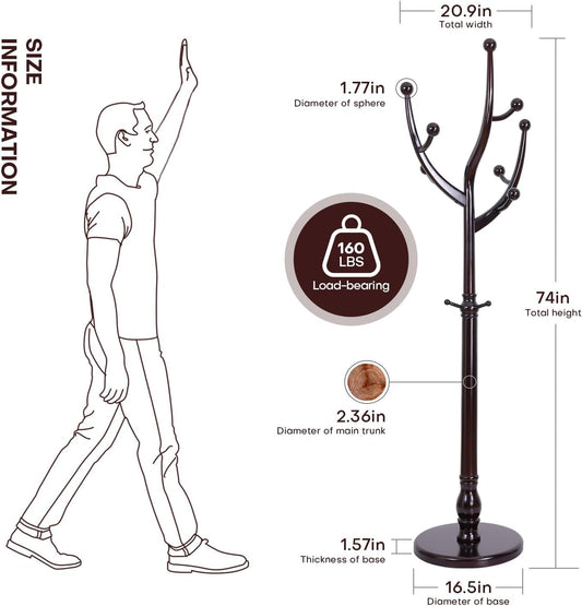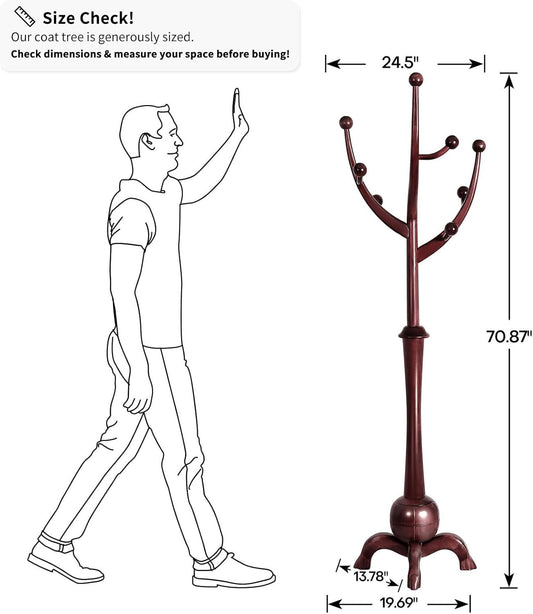 Coat Rack Tree Freestanding with Hooks, Heavy Duty Standing Wood Coat Rack with Solid Round Base, 74” Tree Shaped Coat Hanger Stand for Clothes, Hat, Jacket, Entryway Bedroom, Red Brown