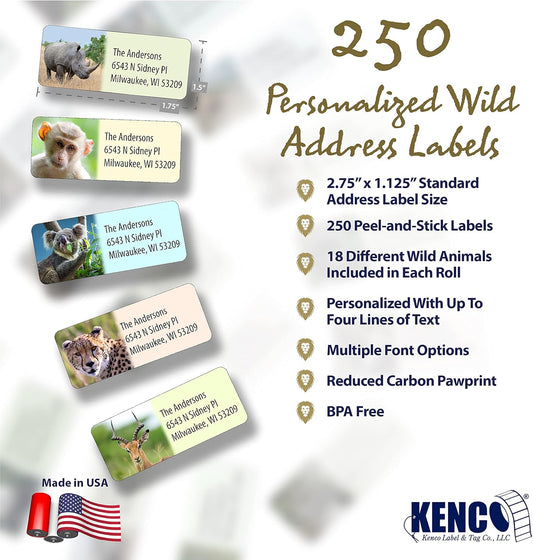Customized Personalized Address Labels - Made in The USA by Kenco (Wild Animals, 250 Labels)