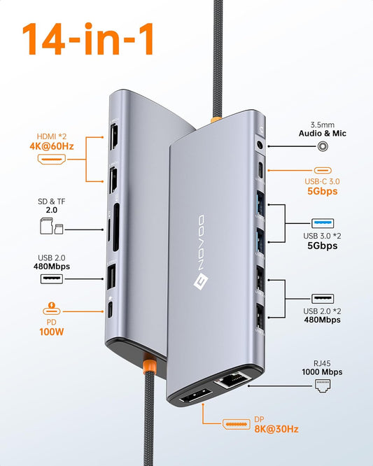 Dell/HP/Lenovo/Surface USB C Docking Station - Dual 4K60 HDMI+8K30 DP, 14 in 1 USB C Hub Adapter with 100W PD, RJ45, SD/TF, Audio, Multiport Dock for MacBook/Laptop