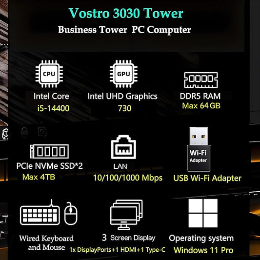 Dell Desktop Computers, 3030 Tower Desktop PC, 14th Gen Intel Core i5-14400 (Beat i7-13620H), 32GB DDR5 RAM, 1TB PCIe SSD, WiFi Adapter, DisplayPort, HDMI, Type-C, Keyboard and Mouse, Windows 11 Pro