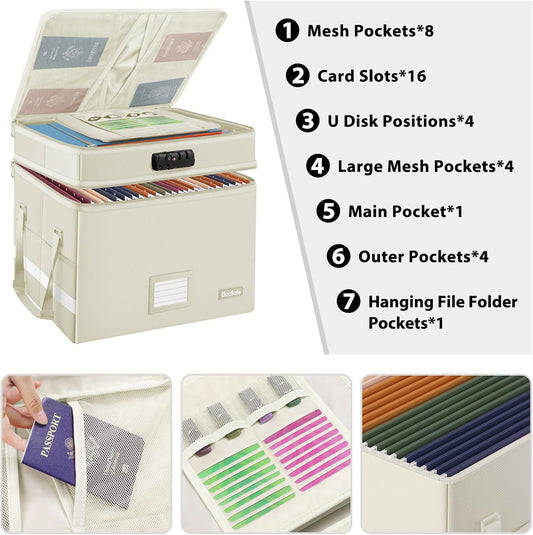 DocSafe File Box with Lock,Multi-Layer Fireproof Document Box Collapsible File Storage Organizer with Pockets/Handle,Large Portable Home Office Filing Box for Hanging Letter/Legal Size Folders,Beige