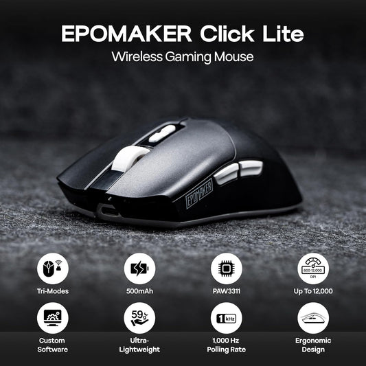 EPOMAKER Click Lite Wireless Gaming Mouse, 800 to 12,000 DPI Adjustable, PAW3311 Sensor, 500mAh, 59g, 2.4G/BT/USB-C Rechargeable Wireless Mouse with 5 Programmable Buttons for PC/Mac/Linux (Black)