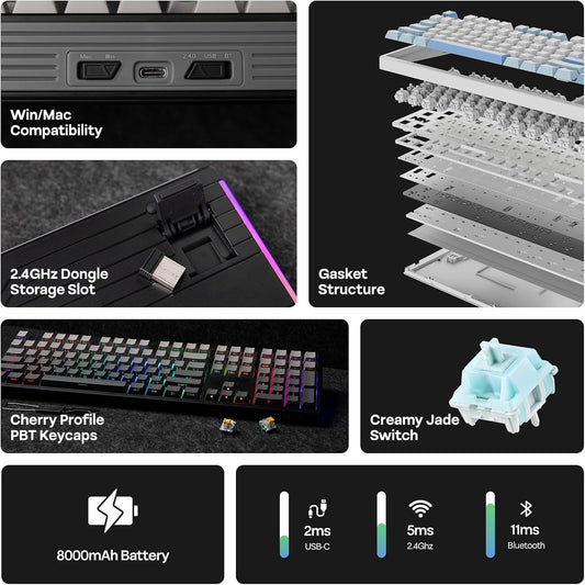 EPOMAKER TH108 Full Size Mechanical Keyboard, Wireless Gaming Keyboard with 8000mAh Battery, Creamy Gasket, 108 Keys, Hot Swap, Custom Driver, RGB Backlight (Black, Creamy Jade)