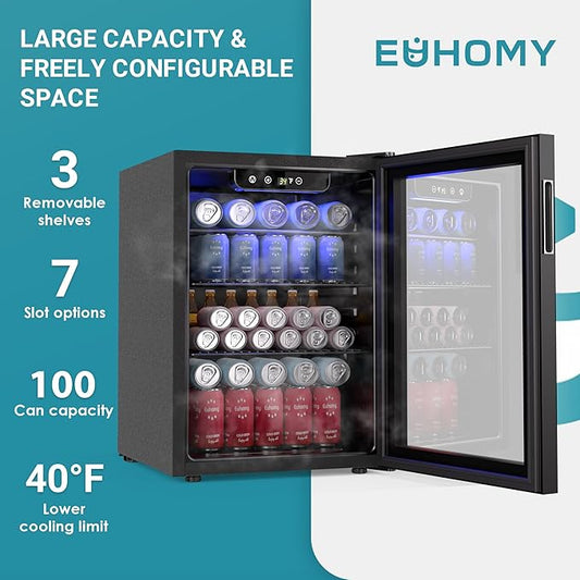 EUHOMY 100 Can Beverage Refrigerator cooler-Mini Fridge Glass Door for Beer Drinks Wines, Freestanding Beverage Fridge with Adjustable Shelves Blue LED for Home/Office/Dorm/Bar, 2.7 cu.ft