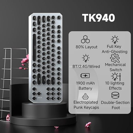EWEADN Wireless Mechanical Typewriter Keyboard,80% Layout with White Backlit, Anti-Ghosting, Blue Switch Bluetooth/2.4GHz/USB-C Aesthetic Keyboard-Black