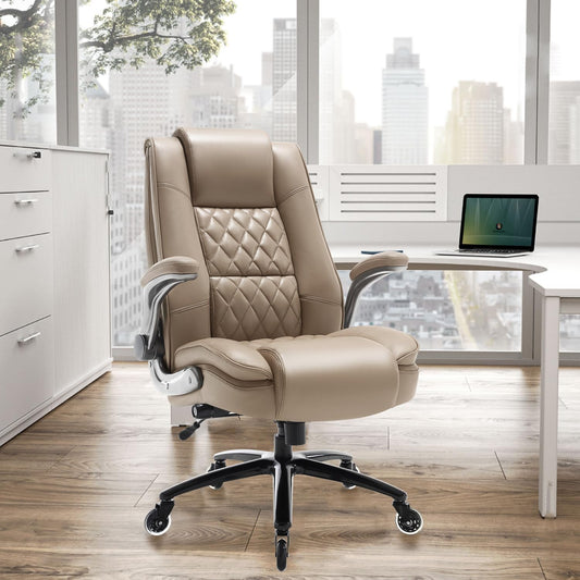 EZAKI High Back Office Chair-Flip-up Arms Executive Computer Desk Chair, Built-in Lumbar Support Thick Padded Adjustable Rock Tension Ergonomic Design for Back Pain (Beige)