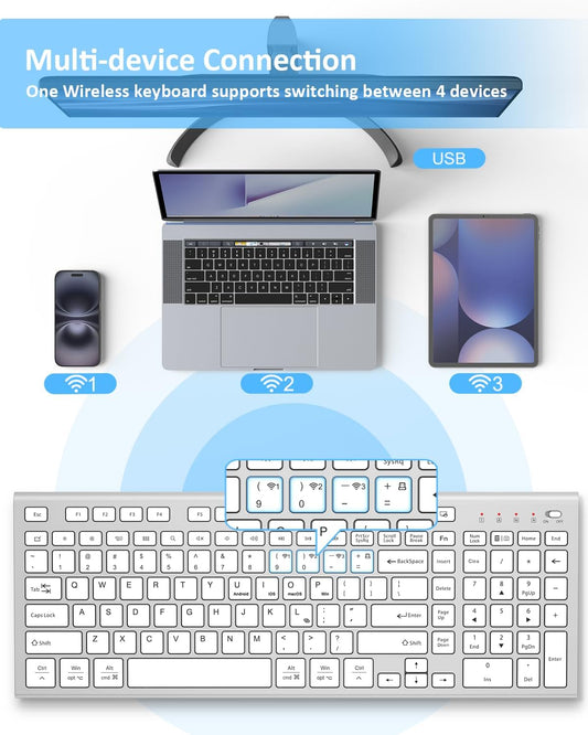 FENIFOX Wireless Keyboard, Bluetooth + USB Ergonomic Silent Quiet Rechargeable with Number Pad Compact Full Size Multi Device Keyboards for iPad Tablet Mac Computer Surface PC MacBook Laptop Silver