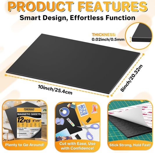 FINDMAG Magnetic Sheets (8” x 10”), Pack of 12, Flexible Magnet for Hanging Pictures, Photos, Paper Magnet for Dies, Adhesive Magnetic Sheets for Fridge, Locker, Cabinet Doors.