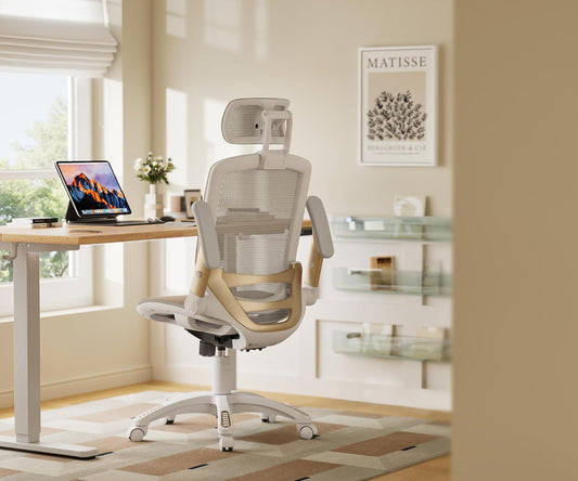 GABRYLLY Ergonomic Office Chair, High Back Home Desk Chair with Headrest, Flip-Up Arms, 90-120° Tilt Lock and Wide Cushion, 400LBS Mesh Chairs for Man Woman, White Task Chair(Beige,GY01WBG)