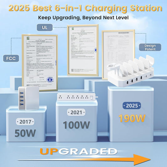190W Fast Charging Station for Multiple Devices【Certified Safer Charging】 6 Port USB Charger Station - Family Multi-Device Organizer Charging Dock Compatible with iPhone/Android/MacBook/iPad/Tablet