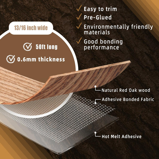 GSCIT Club Oak Wood Veneer, 12 inch x 50ft Wood Red Oak Edge Banding Pre-glued Flexible, Veneer Tape Banding for Cabinet Repair Furniture Restoration