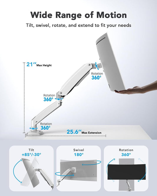 HUANUO Single Monitor Arm 13-34 Inch, Adjustable Gas Spring Arm, Monitor Desk Mount for 4.4-22lbs, VESA 75/100mm with C-Clamp/Grommet Base, Ergonomic Stand for Work/Gaming
