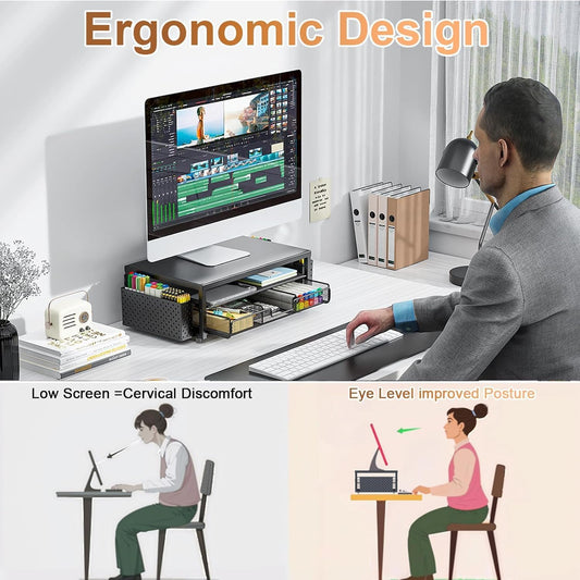 gianotter Desk Organizers and Accessories, Monitor Stand with Drawer and 2 Pen Holder, Desktop Organizer Suitable for Offices and Dormitories (Black)