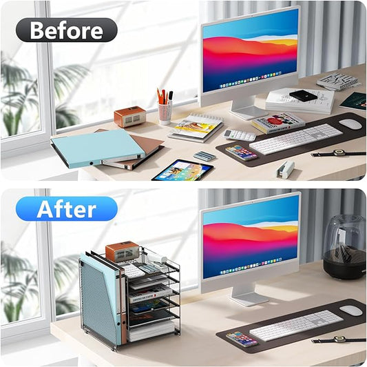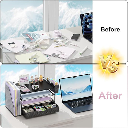 gianotter Desk Organizers and Accessories with File Holder, 4-Tier Desk Accessories & Workspace Organizers with Drawer and 2 Pen Holder, Paper Organizer for Office Supplies (Black)